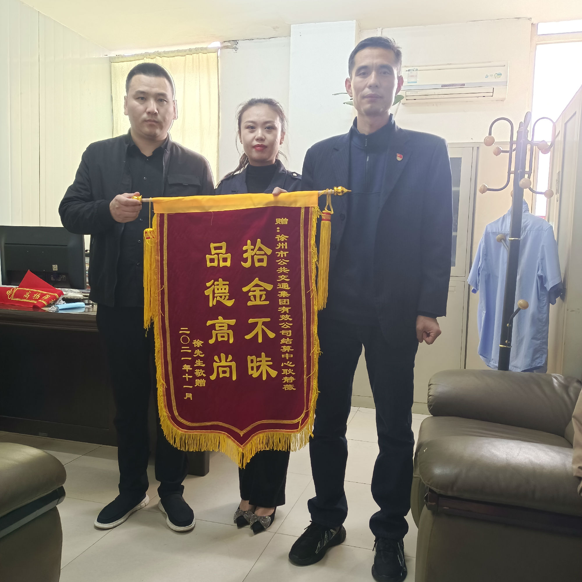 原來11月2日早上,結(jié)算中心職工耿靜薇在上班途中,經(jīng)過夾河街路口時(shí),無意中發(fā)現(xiàn)一個(gè)黑色手包,等待許久未見失主前來尋找,便將手包帶到了公司。經(jīng)檢查,包內(nèi)有銀行卡,手機(jī)及部分現(xiàn)金,但未找到任何聯(lián)系方式,這時(shí)失主的手機(jī)鈴聲響起,傳來了失主焦急的聲音。不一會(huì)兒,失主徐先生趕到結(jié)算中心,領(lǐng)回了物品。次日,徐先生特意送來錦旗,并表示衷心的感謝!