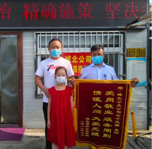 7月24日上午,市民張先生一家人專程來到楊山路調度室,將一面寫有“愛崗敬業(yè)、服務周到、情暖人間、大愛無疆”字樣的錦旗送到73路駕駛員鹿偉的手中,感謝他幫助迷路的孩子找到家人。