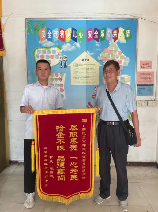 2022年7月25日上午,市民陳老先生拿著一面印有“盡職盡責一心為民,拾金不昧品質高尚”的錦旗,來到徐州公交新巴士公司湖濱調度室,表揚和感謝18路公交駕駛員張猛。