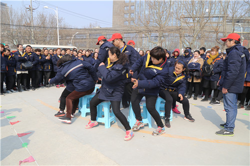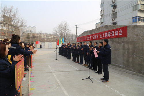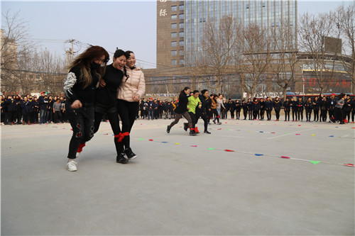 “參賽隊(duì)員各就各位!裁判員準(zhǔn)備計(jì)時(shí)!”運(yùn)動(dòng)會(huì)主持人一聲令下,首先開(kāi)始比拼的項(xiàng)目是需要隊(duì)員齊心協(xié)力,發(fā)揚(yáng)合作精神的“三人四足接力賽”,三人一組紅繩綁腿齊步走,每隊(duì)12名參賽隊(duì)員,比的是速度,更是勁兒往一處使的同心合力?!凹佑?!加油啊!”“一二!一二!”比賽場(chǎng)上運(yùn)動(dòng)員的號(hào)子聲和場(chǎng)外女工們的加油聲、歡笑聲交織一起,此起彼伏。