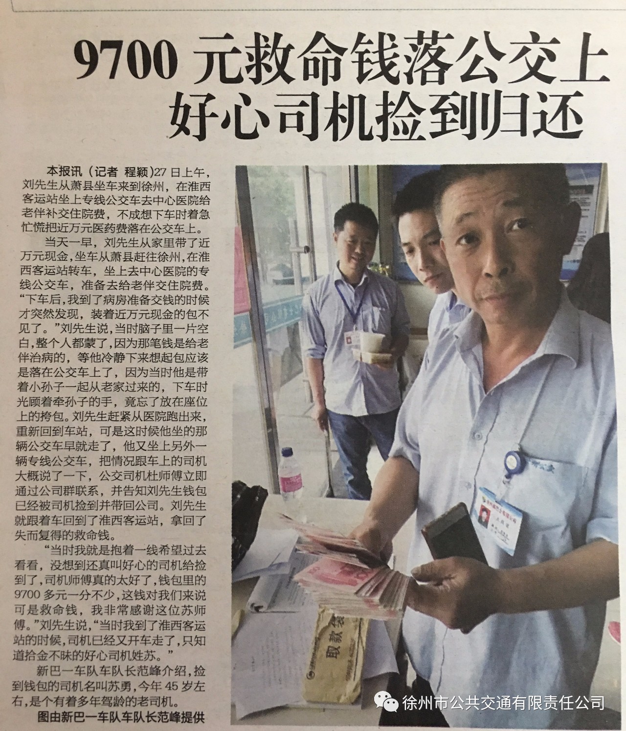 車隊管理人員打開包尋找乘客的聯(lián)系方式,發(fā)現(xiàn)包里有一個信封,信封里面裝著9700元現(xiàn)金,便立即將包妥善保管。不久,失主劉先生來到調度室尋找,看到失而復得的包裹十分激動,他說:“我抱著一線希望來這兒看看,沒想到還真叫好心的司機給撿到了,9700元一分不少。這錢對我們來說是救命錢,今早到醫(yī)院給老伴補交住院費的,我非常感謝蘇師傅”。