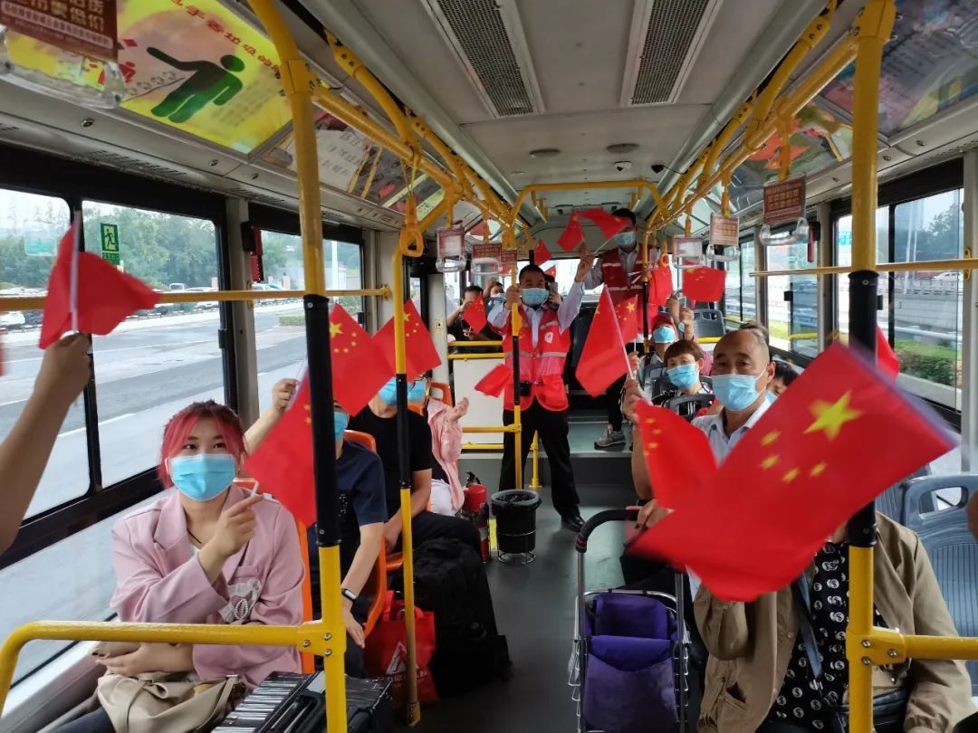 志愿者們走進(jìn)公交車廂,現(xiàn)場與乘客們互動,通過提問節(jié)日和防疫小知識,獎勵口罩、紅旗、鑰匙環(huán)等小禮物,并與市民乘客們共唱《我和我的祖國》,熱鬧歡慶的氣氛感染了整個車廂,彰顯了“奉獻(xiàn)、友愛、互助、進(jìn)步”的志愿精神。