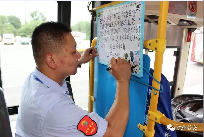 原來(lái)他已養(yǎng)成了習(xí)慣,在他的駕駛室后方掛著一塊白板,寫(xiě)著乘車(chē)的溫馨提示語(yǔ)和天氣情況。每天他都會(huì)記錄下當(dāng)天的天氣情況:“為了您的乘車(chē)安全,請(qǐng)不要隨意更換座位。感謝您的支持!2018年7月12日星期四,多云到晴,27~34攝氏度”,“特別是老年人、孩子,開(kāi)車(chē)時(shí)換位子太危險(xiǎn)了?!毖λ山忉尩?。